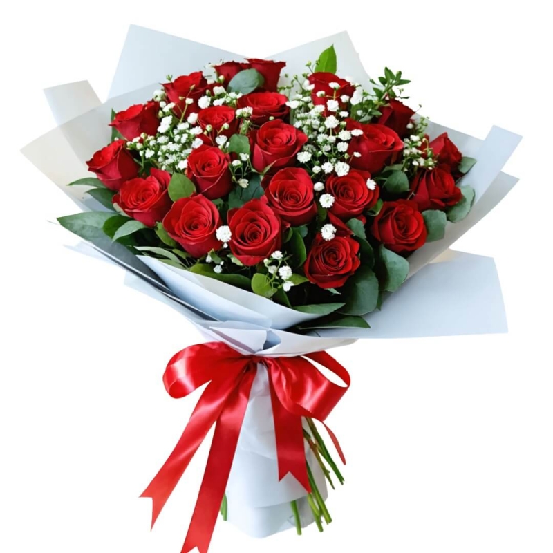 The 25 red roses created a full, classic bouquet. Rich color and balanced shape just like on the picture.