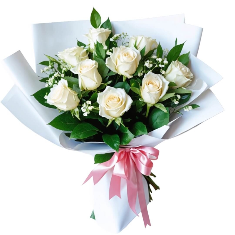 - Склад: 9 преміальних білих троянд (довге стебло).